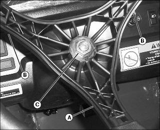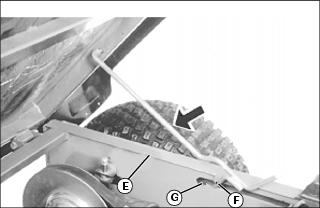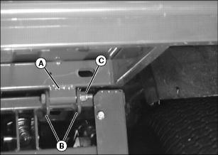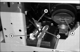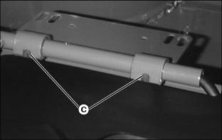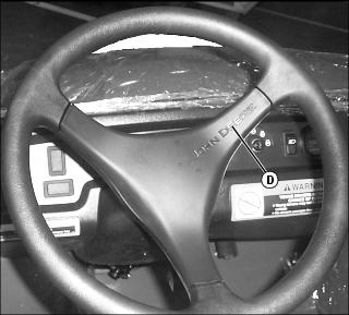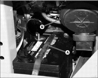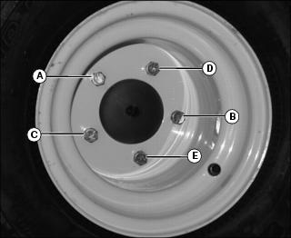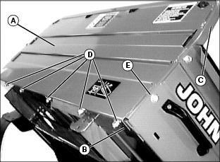 AssemblyPrepare Vehicle For Assembly1. Remove top and sides of shipping crate. 2. Remove seats and packaged parts from vehicle. 3. Remove tires from cargo box and sides of vehicle. 4. Locate two shipping brackets (A) on each side of vehicle frame. 5. Remove self-tapping screws (B) at each side. Retain these four screws to install the load guard later. 6. Lift cargo box off vehicle frame. 7. Remove self-tapping screws (C) and shipping brackets (A). Discard the shipping brackets. 8. Install two self-tapping screws (C) back into holes on the right side of machine previously removed. Install one of these screws into rear hole on left side of machine. Discard the last screw. 9. Remove and discard the shipping hardware securing the vehicle to pallet at foot platform and rear frame. Remove Batteryˇ 4x2 - Access under passenger seat. ˇ 6x4 - Access through opening at rear of vehicle. Picture Note: GATOR 6x4 shown. 2. Disconnect rubber hold-down strap (A). 3. Release latches on air cleaner canister cover (B). Remove cover to provide clearance for battery removal. 4. Remove battery from vehicle. Remove and discard the protective cap from the negative (-) terminal. 5. Install air cleaner cover with rubber dust unloading valve pointing downward. Check instruction molded into canister cover for proper installation. Check Battery VoltageBattery is filled with acid and charged when it left the factory. To extend battery life, check voltage prior to delivery. Fully charge the battery if voltage is less than 12.6 volts. Reduce Tire Pressure2. Check all tires with an accurate gauge. Reduce pressure to 34 - 41 kPa (5 - 6 psi). Install WheelsInstall Rear Wheels1. Measure circumference of rear tires. Select the wheels with largest tire circumference for the most rearward position to provide the best ground contact for drive wheels. 2. Install plastic cap on each rear axle hub. 3. Raise rear of vehicle with a safe lifting device. Place support stands under vehicle. 4. Attach each rear wheel to axle hub with valve stem to outside using five wheel bolts. Tighten wheel bolts evenly in proper sequence (A), (B), (C), (D), and (E) until snug. Finish tightening to 90 Nˇm (65 lb-ft) using a torque wrench. 5. Remove support stands and lower vehicle. Install Front Wheels1. Raise front of vehicle with a safe lifting device. Place support stands under vehicle. 2. Slide front wheels onto front axle hubs. 3. Secure front wheels with M16x40 flanged cap screws. Tighten cap screws to 90 Nˇm (65 lb-ft) using torque wrench. Install Spark Arrestor (4x2)NOTE: Spark arrestor is factory-installed on 6x4 utility vehicles. 1. Align hole in spark arrestor (A) with pre-drilled hole in muffler pipe. 2. Slide screen end of arrestor into muffler pipe. 3. Install and tighten tap screw (B) to secure. Install Steering Wheel1. Remove and discard plastic protective cap from steering shaft. 2. Install steering wheel onto steering shaft. Turn steering wheel to position front wheels straight and facing forward. 4. Apply multi-purpose grease to steering shaft. 5. Install steering wheel onto steering shaft with one spindle (A) positioned at 180° at bottom of wheel and spindles (B) at approximately 45° at top of wheel. 6. Position front wheels straight and facing forward. 7. Install steering wheel onto steering shaft. 8. Install nut (C) and tighten until snug. 9. Install cover (D) so the John Deere name is positioned properly. Install Seats1. Remove screws (A) from bottom of seat base bracket on each seat. NOTE: Apply silicone lubricant to inner surface of seat bushings to improve ease of seat rotation if desired. 2. Install seat bushings (B) onto support rail so tabs face toward rear of vehicle. 3. Position seat base bracket onto support rail so hinges (C) fit around plastic bushing tabs. NOTE: Install seat hardware in the correct slots in the bracket. Always use set of slots closest to center of vehicle when installing seat. 4. Rotate seat bracket upward. Install original hardware in slots closest to center of vehicle to secure seat. Do not tighten completely. 5. Slide seat forward or rearward to desired position. 6. Tighten seat screws to 10 Nˇm (7 lb-ft). Install BatteryPicture Note: GATOR 6x4 shown. 1. Remove air cleaner canister cover (A) to provide clearance for battery installation. 2. Install battery into vehicle with negative (-) terminal (B) positioned toward rear of vehicle. 3. Install air cleaner canister cover with rubber dust unloading valve pointing downward. Check instruction molded into canister cover for proper installation. 4. Secure battery hold-down strap (C). 5. Install red positive battery cable (D) to positive (+) terminal first using M6x16 cap screw, flat washer, and nut. Tighten the connection. 6. Install black negative battery cable to negative (-) terminal last using M6x16 cap screw, flat washer, and nut. Tighten the connection. 7. Apply petroleum jelly on battery terminals to help prevent corrosion. 8. Slide protective cover down the battery positive cable and seat it over the positive (+) terminal. Install Cargo Box1. Position cargo box onto vehicle frame so hinges (A) are positioned inside pivot brackets (B). 2. Secure cargo box using M12x90 cap screws and flanged lock nuts (C). Install cap screw with threads to the outside of vehicle. 3. Tighten cap screws until pivot brackets contact ends of hinge. 4. Apply a spray lubricant to the pivot hardware, hinges, and pivot brackets. NOTE: The 90° bent end of support rod is already installed in cargo box frame. 5. Raise and hold cargo box securely. Cut tie strap to release cargo box support rod (D). 6. Push inward on support rod forcing it over sill (E). 7. Route end (F) of support rod into slot (G). Install Load Guard1. Install load guard (A) to cargo box so bottom lip (B) is positioned on underside of box and square tube frame (C) is to the inside of box. 2. Secure bottom of load guard with M8x20 carriage bolts, flat washers, and flanged lock nuts (D). Tighten nuts
