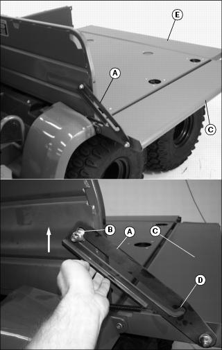 4. Pull up tailgate (E) to close and snap latch rods back into holes at the same time.