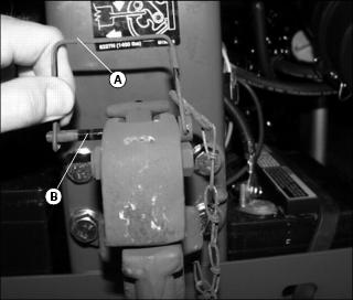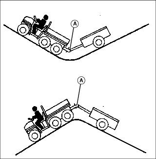 IMPORTANT: Avoid damage! Extreme angles such as high railroad crossings can place high bending loads on hitch connection (A). Traversing terrain where the preceding conditions exist, use a ball or pintle type hitch.