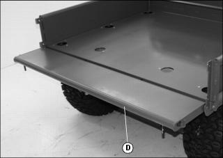 3. Lower tailgate (D) until resting on tailgate support arm. Latch hook/arm into tailgate.