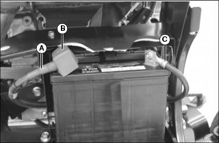 2. Connect black negative (-) cable (C) to battery. Apply petroleum jelly or silicone spray to terminal to prevent corrosion. Make sure connection is tight.