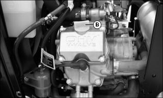 8. If oil level is low, remove oil filler cap (B) on right side of machine.