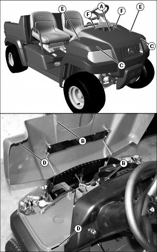2. Slide engine panel forward to engage three front tabs (E) into seat base panel slots (F).