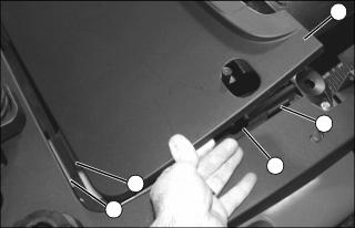 5. Grasp corners (A) of engine panel. Lift up and pull rearward to unsnap rear and front lock tabs from seat base panel.
