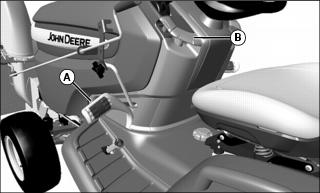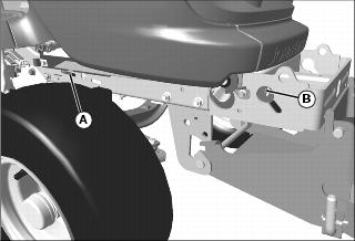 3. Lower attachment. With attachment lowered, pull back firmly on lift pedal (A), then pull up on lift lock handle (B) to lock the pedal.