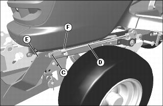 5. Loosen nut (F) and turn end of outer lift rod clockwise to gain lift height, and counterclockwise to reduce lift height. Tighten nut (F).