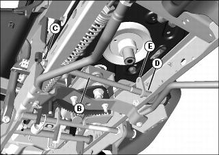 2. Install small end of rockshaft (B) through hole (C) on right side of machine frame, then pull large splined end through hole (D) on left side of machine frame. Make sure bracket (E) on rockshaft is pointing up.