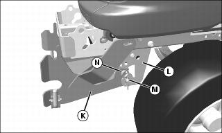 6. Align hole in front attachment hitch (K) with hole in front draft assembly (L) and install front draft pin (M). Secure with large M4.5 spring locking pin (N).