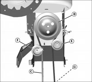 • Belt is routed around gearbox drive sheave (D), and inside of belt guards on idler sheave (E) and tensioning sheave (F), then to machine drive sheave (G).