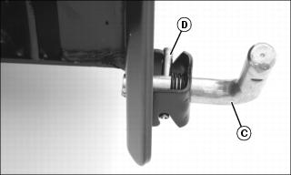 5. Rotate both L-pins (C) on the tractor front quick hitch, and turn to unlocked position with roll pin (D) in grooves as shown.