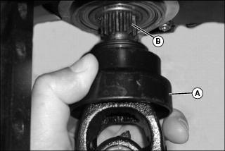 4. Pull back collar (A) on PTO shaft coupler. Pull driveshaft straight back until it disconnects from PTO output shaft (B).