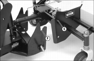8. Drive tractor back slowly until pins (E) in broom frame disengage from notches (F) in hitch.
