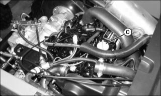8. Check radiator hose (C) between intermediate tubes and radiator for damage or cracking. Replace if necessary.