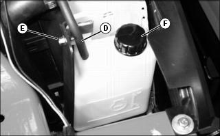 10. Remove the screw (E) and lift recovery tank out of machine.