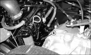 6. Remove and discard oil filter (B) on front of engine. Wipe off filter base on engine.