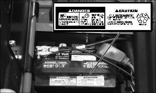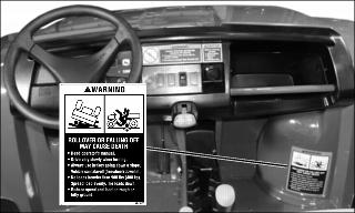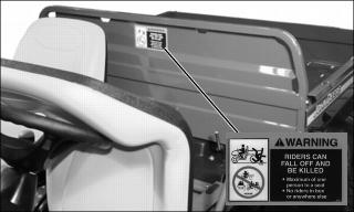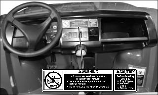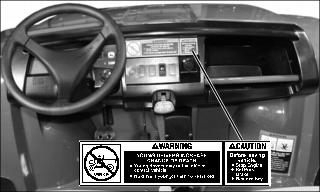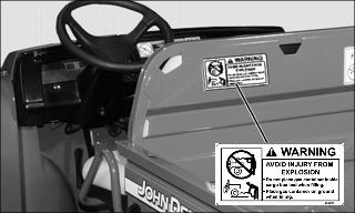 Safety LabelsUnderstanding The Machine Safety LabelsThe machine safety labels shown in this section are placed in important areas on your machine to draw attention to potential safety hazards. On your machine safety labels, the words DANGER, WARNING, and CAUTION are used with this safety-alert symbol. DANGER identifies the most serious hazards. The operator's manual also explains any potential safety hazards whenever necessary in special safety messages that are identified with the word, CAUTION, and the safety-alert symbol. WARNING: ROLLOVER OR FALLING OFF MAY CAUSE DEATH· Drive very slowly when turning. · Always use brakes going down a slope. Vehicle can take-off (freewheel) downhill. · No loads heavier than 900 lbs (408 kg). Spread load evenly. Tie loads down. · Reduce speed and load on rough or hilly ground. CAUTIONWARNING: YOUNG DRIVERS INCREASE CHANCE OF DEATH· Young drivers may not be able to control vehicle. · No drivers younger than 16 years old. WARNING: AVOID INJURY FROM EXPLOSION· Do not place gas container inside cargo box bed when filling. · Place gas container on ground when filling. WARNING: RIDERS CAN FALL OFF AND BE KILLEDPicture Note: Two decals. One on each side of load guard. · Maximum of one person to a seat · No riders in box or anywhere else DANGER:SHIELD EYES· EXPLOSIVE GASES can cause blindness or injury NOSULFURIC ACID· Can cause blindness or severe burns CAUTION· Flush eyes immediately with water. · Keep out of reach of children. · Keep vent caps tight and level. Emission Control System Certification LabelThe emissions warranty described in the warranty section applies only to those engines marketed by John Deere that have been certified by the United States Environmental Protection Agency (EPA) and/or California Air Resources Board (CARB); and used in the United States in non-road mobile (self-propelled or portable/transportable1) equipment. The presence of an emissions label like the one shown signifies that the engine has been certified with the EPA and/or CARB. The EPA and CARB warranties only apply to new engines having the certification label affixed to the engine and sold as stated above in the geographic areas governed by the regulating agencies. NOTE: The hp/kW rating on the engine emissions certification label specifies the gross engine hp/kW, which is flywheel power without fan. In most applications this will not be the same rating as the advertised vehicle hp/kW rating. Emission Compliance PeriodIf your engine has the emission compliance category listed on the emission control system certification or air index label, this indicates the number of operating hours for which the engine has been certified to meet EPA and/or CARB emission requirements. The following table provides the engine compliance period in hours associated with the category found on the certification label. SAE J2258 and ASME B56.8 ComplianceThis vehicle conforms to SAE J2258. With installation of the optional horn kit, this vehicle conforms to ASME B56.8. |