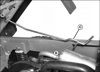 3. Raise tailgate slightly from horizontal position. Insert end of latch rod through slot (D) in cargo box bracket. Rotate rod around the bracket to secure.