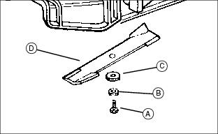 4. Loosen and remove cap screw (A), hardened washer (B), blade washer (C) and blade (D). (Note: No hardened washer on 48C.)