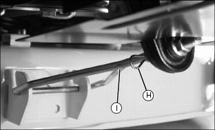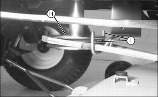 11. Put mower drive belt on engine drive sheave (H) and route through both belt guide loops (I). Make sure belt is on all sheaves and idlers and is inside all belt guides, front and rear.