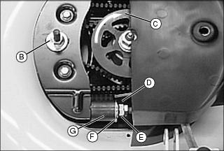 IMPORTANT: Avoid damage! Make sure locator on belt guide (E) is aligned with hole on fixed idler (D) mounting bracket before tightening.