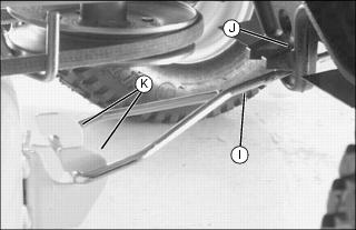 10. Remove front draft rod (I) from hole in tractor bracket (J) and from mower brackets (K).