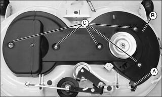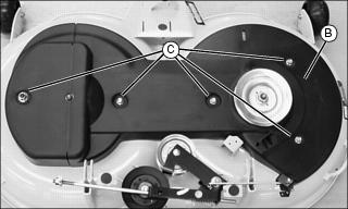 9. Align belt guide locators with holes in deck and tighten belt guides (C).