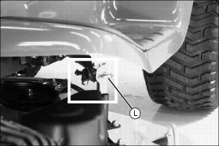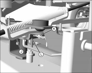 13. Pull down PTO rod bracket (J) and insert drilled pin (K) into bracket (L) on mower deck.