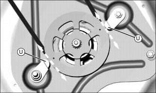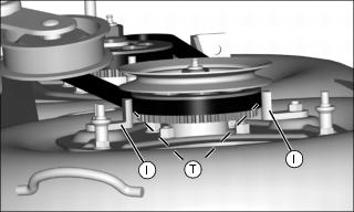 a. Hold a 1 mm (0.039 in.) shim/gage between belt guides and sprocket rim, location (T), and rotate belt guides (I) clockwise against gage.