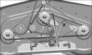 6. Loosen rear idler (B) and tensioning sheave (C). On 42C deck, also loosen fixed idler (D).