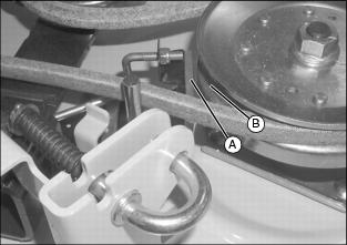 10. Align notch in belt guide on fixed idler with locator on idler bracket and tighten idlers (B).