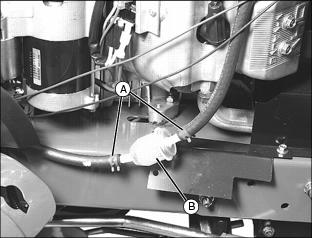 5. Slide hose clamps (A) away from fuel filter (B) using pliers.