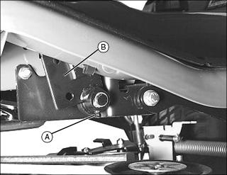 1. Lubricate grease fitting (A) for lift pedal (B) with enough grease to flush out dirt.