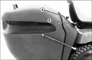 · If fill is too high (D) or if grass collector plugs, raise latch (B) to begin audible sound with less fill.