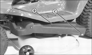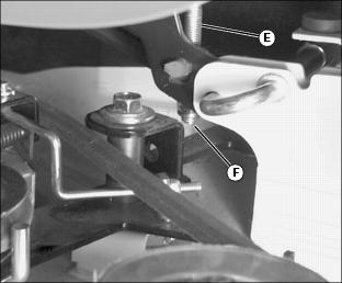 a. Turn nuts (F) on both sides one turn counterclockwise to lower the mower deck.