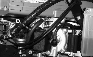 5. Locate hose (B) between water pump and cylinder head on left side of engine. Loosen upper hose clamp with pliers.