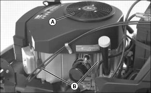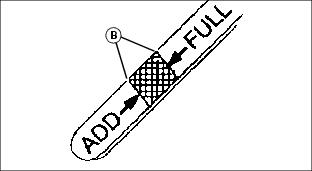 7. Check oil level on dipstick. Oil must be between ADD and FULL marks (B).