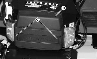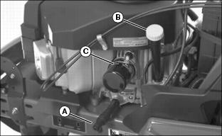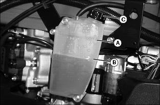 4. Remove cap (C) from recovery tank if coolant is low. Add ethylene glycol antifreeze (without stop-leak additive) and water in a 50:50 ratio to bring coolant up to proper level.