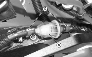 6. Use a pliers to slide hose clamps (B) away from fuel filter.