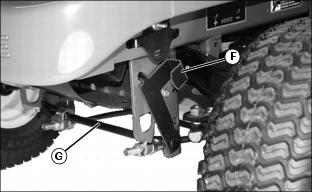 10. Place front lift rod (E) into frame hooks so lever (F) is at left side of machine. Make sure rod is seated in frame hooks.