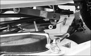 12. Remove drive belt tension rod (H) from bracket (I) and pivot rod as far as possible toward rear wheel to remove all belt tension.