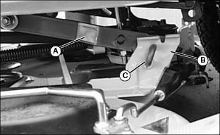 8. Release J-pin (C) to connect mower deck to lift arms. Repeat at other side.