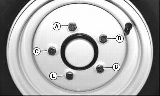 Tighten rear wheel bolts evenly in proper sequence (A), (B), (C), (D), and (E) until snug. Finish tightening to 55 N·m (41 lb-ft).