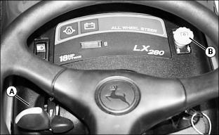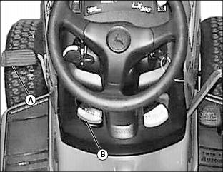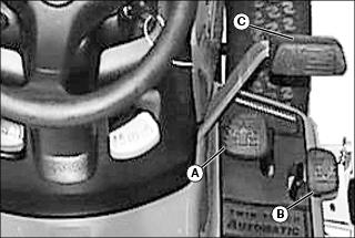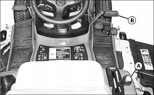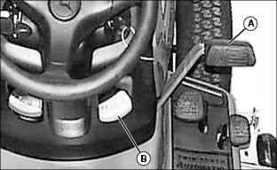 · Push down park brake pedal (B), then move cruise control lever (A) completely rearward to OFF position.