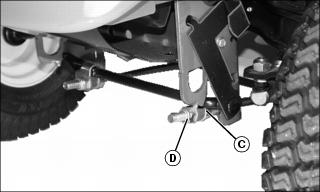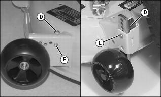 · 42 Inch and 48 Inch Mower - Remove spring locking pin (D) and drilled pin (E). Move wheel to proper hole position. Install pins.