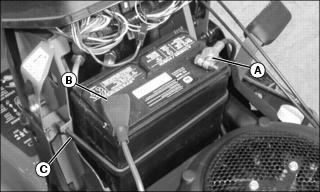 1. Place battery on battery tray so battery posts are facing toward front of machine.
