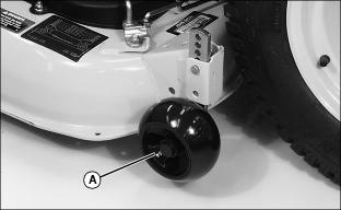 Lubricate mower wheel grease fittings (A).