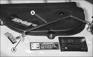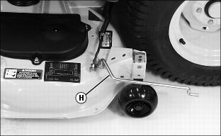 15. Pivot drive belt tension rod toward front of machine to tighten drive belt. Hook tension rod into bracket on mower.