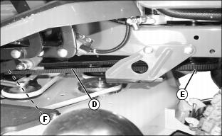 5. Remove mower drive belt (D) from machine drive sheave (E) and mower drive sheave (F).