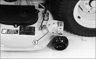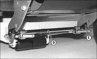 10. Place front lift rod (D) into frame hooks so lever (E) is at left side of machine. Make sure rod is seated in frame hooks.