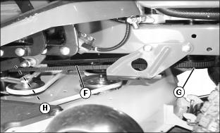 9. Remove mower drive belt (F) from machine drive sheave (G) and mower drive sheave (H).